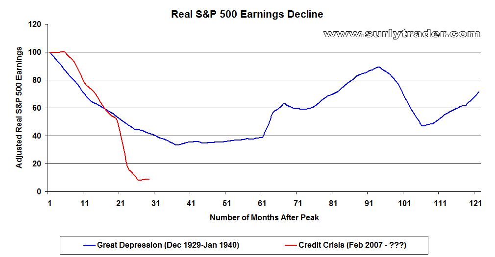 One piece of data that has notoriously been missing from all financial publications is the precipitous decline in corporate earnings as compared to previous recessions. The speed and depth of this decline surpassed that of even the great depression with over 90% of corporate earnings disappearing in about 2 years. It appears that the decline has bottomed out, but most of that has been due to the quick resolve of corporations in cutting capacity and costs along with strong government intervention. At current levels of earnings, the P/E multiple can only be rationalized with the expectation that earnings will snap back quickly as the economy rebounds. I think we all need to keep an eye on the consumer because 10% unemployment and high levels of household debt will continue to stifle any rebound in corporate profits.