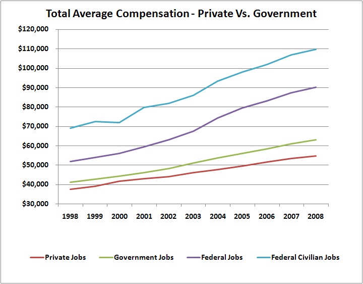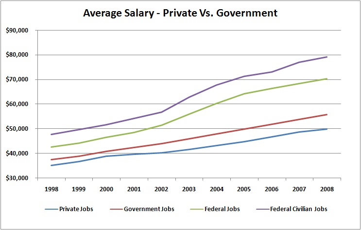 As we look at the efficacy of government programs in general, I think it is important to take a step back and look at the government as a corporation. The government can be viewed as an all powerful monopoly that has control over its own income, something that every other corporation operating in a competitive industry should be envious of. The government is an organization like many others and therefore requires many of the same mundane positions: secretaries, accountants, financial analysts, project managers and other paper pushers. That being said, there are definite differences between government positions and private positions so it is difficult to tease out true apple to apple comparisons. For instance, there might be quite a few cafeteria workers in government jobs but not nearly as many as in the private restaurant businesses. Such a percentage difference can overstate average government salaries because there are not as many low salaries dragging the average down. Likewise, there might be more college educated jobs in government spots versus the private sector, though I would argue that this difference should have decreased dramatically as the US economy has become more driven by intellectual property and less by manufacturing. With all of these caveats in place, let us dig into the numbers:
