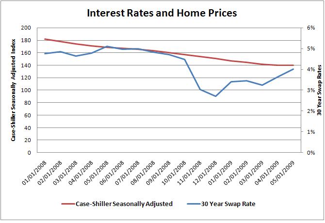 One thing that I believe has been glossed over in the media are the rising mortgage rates. As mortgage rates rise, the affordability of homes goes down. That’s a pretty simple concept. Just how far mortgage rates increase is critical because a 6.5% mortgage versus a 5% mortgage make a dramatic difference in an investors interest in a home as a rental property. The May Case-Shiller number was better than expected even on a seasonally adjusted basis, but home prices are still declining. Since that time, mortgage rates have increased even further and it will be interesting to see if that, combined with coming out of the home-buying season will put further pressure on house prices. Another important thing to consider is this: a lot of the foreclosures are being bought by “investors” who want to rent out the properties until the property value recovers. What happens if those investors are bitten by a further decline in house prices and falling rents? Are those same investors going to come back to the market next year to try it again with 6-7% mortgage rates? Not to mention with 10% unemployment it will be fun to try to collect rents when they run out of unemployment aid.