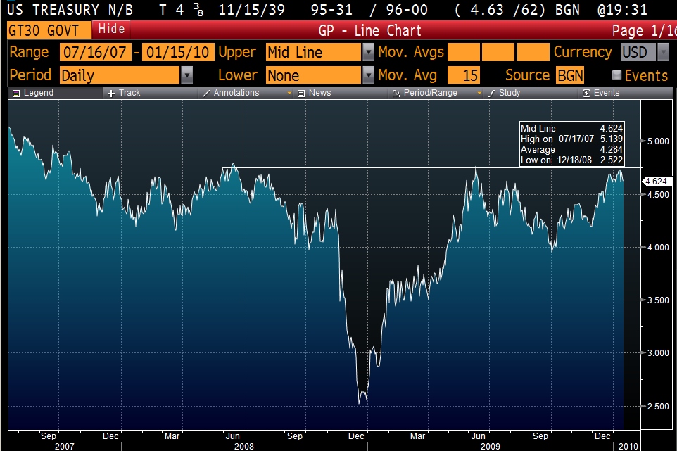 Low interest rates are the lifeblood to a debt burdened economy. Back in October 2009, when 30 year treasury yields were at 4%, I suggested that getting short treasuries or selling call options on treasuries would be a good strategy for the coming months. It turns out that I made a wise call, because since then 30 year rates have risen over 60 basis points and are trading near 2 1/2 year highs. So, what comes next?
