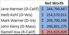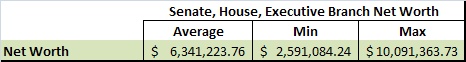 I recently ran across a news article that said 237 or 44% of the members of Congress are millionaires. I had to do a little bit more digging to see what this actually meant. It turns out that the members of the senate, house and executive branch are required to disclose a range for the value of all assets and liabilities. This does not give us an exact metric to base net worth, but it gives us a pretty clear picture of our governing body. The average net worth of our governing elite is $6.3M.