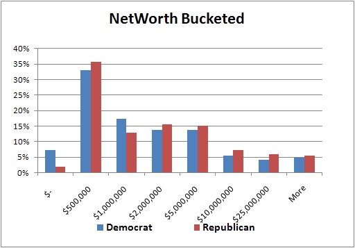 If we look at the distribution of wealth, it seems that the two are fairly evenly matched. More democrats have negative net worth, but edge out republicans in the $500k-$1M bucket.