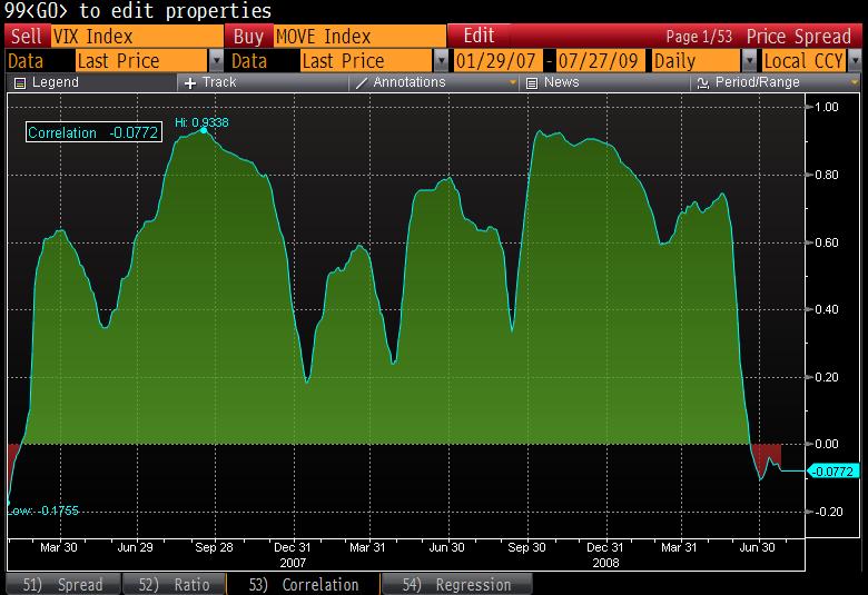 The Merrill lynch Option Volatility Estimate (MOVE) Index is a yield curve weighted index of the normalized implied volatility on 1-month Treasury options which are weighted on the 2, 5, 10, and 30 year contracts. I am bringing this index up because its seems to me that there is a discrepancy between Treasury option volatility and Equity option volatility. We have watched the VIX slowly grind down to pre-Lehman bankruptcy levels in a very methodical way whereas the implied volatility and realized volatility in the Treasury market has remained fairly elevated and the volatility of volatility has been quite large as well. I have a general understanding of why the treasury market has been volatile – because concerns over inflation, deflation, and a massive rolling of Government debt has the market freaked out and they do not know which direction to expect. Good news comes out and inflation fears spike, bad news comes out and treasury yields drop. The moves have been dramatic in the treasury and swap markets. What I do not understand is the equity market’s rather ambivalence towards the subject. I would think that inflation or deflation fears should put the fear of god into the equity markets as well. I am not suggesting that equities cannot rally, but at the very least the volatility of equities should take into consideration the fear of inflation or deflation.