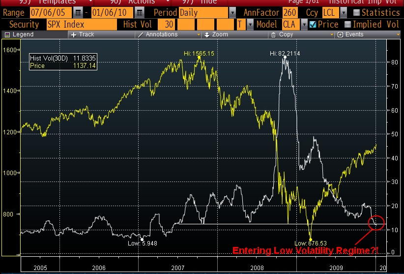 Historical 30-day volatility has recently hit a low of below 12%. A volatility of 12% means that we are experiencing daily moves on the S&P 500 of about .75%. My belief is that this is much too low. When top economists such as Krugman and Morgan Stanley’s Stephen Roach are placing 40% odds of a double dip global recession by the end of 2010, I find it improbable that we can expect daily moves of less than 1%. In addition, the historical periods following the great depression’s market bottom and the Japanese asset bubble bottom were ripe with volatility. For over 7 years after the market bottoms the returns remained turbulent.