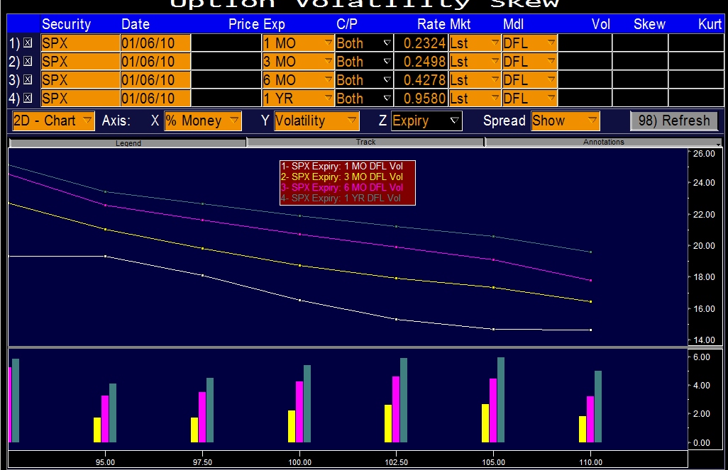 By examining the skew and term structure of implied volatility, you can see that options with longer maturities have higher implied volatilities than options that expire soon. In addition, we still see a pretty strong skew, meaning that out of the money put options are trading for quite a bit higher implied volatility than at the money put options. This structure provides a very good way to take advantage of a view that realized volatility will pick up soon while long term volatility will be lower than the ~24% that out of the money put options are trading at.