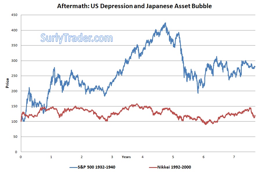 The equity market volatility was over 30% for nearly 8 years after the bottom was reached during the great depression. After the bottom was reached in Japan’s asset bubble, equity volatility was nearly 23% for 8 years.
