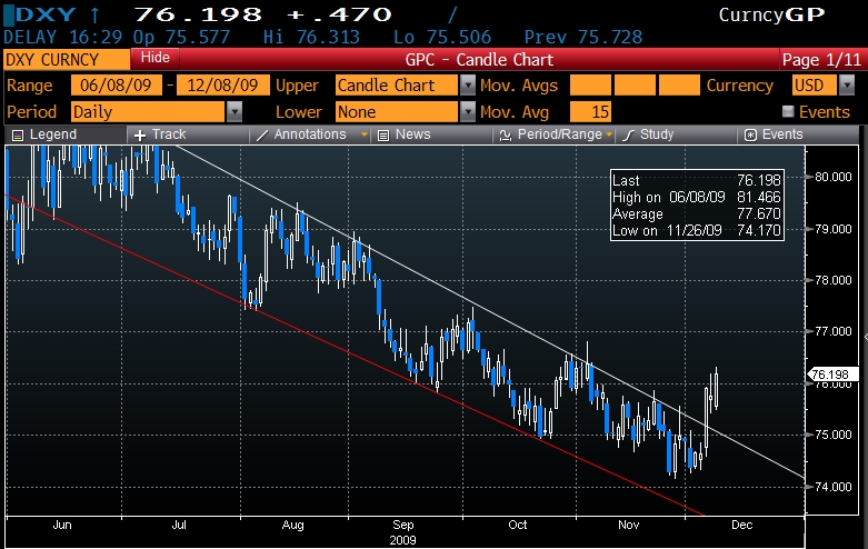 Lastly, let me jump back to my original article of “Expect the Unexpected”. It turns out that I called an upward breakout of the dollar back in December 2009. Now, I am almost ready to call the dollar downside breakout as the Euro has stabilized and the carry trades are back on. Trade du jour – borrow in the cheap currencies and plow the money back into risky assets.