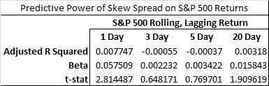 As with all financial time series, the question that comes to mind is what this variation in skew tells the investor over time. The easiest way to look for any information is to perform a simple linear regression on the time series data. In this case, I looked at the predictive power of the skew spread on changes in the S&P 500 over time. We start with a hypothesis: that a high level of skew (generally put options being bid much more aggressively than call options) would indicate that the market is overly scared and we would expect a positive return following a jump in skew. If we do a few simple tests, the results really do not show us much, if any, correlation: