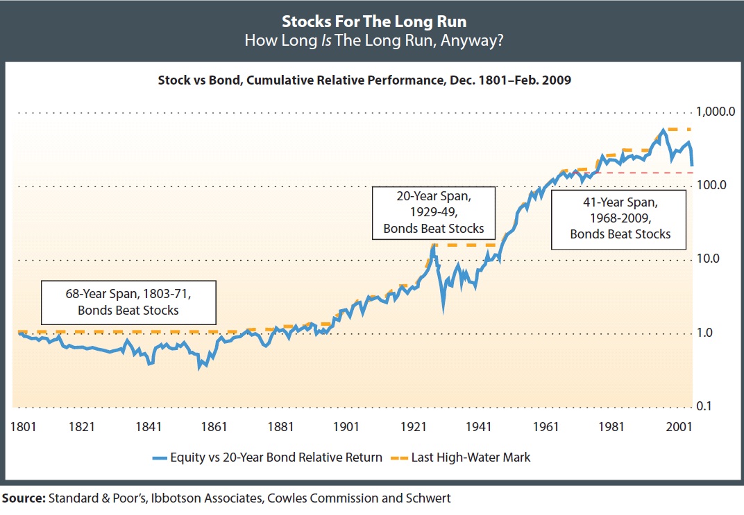 The misconception about equity returns and the statement “stocks always outperform over the long run” is as misleading as it gets. The problem is that we can all simply calculate the average return from stocks for the last two hundred years and make a generalization that on average stocks have returned 8 or 9% per year. What this does not tell you is what happened during that period. Were there periods where you would have been much better off owning government securities or corporate bonds had higher returns? The simple answer is yes. As Robert Arnott pointed out in his rather enlightening piece entitled “Bonds: Why Bother?“, treasuries have outperformed stocks the last 41 years between 1968 and February 2009. There goes the rather pervasive assumption that stocks are a better long-term investment.