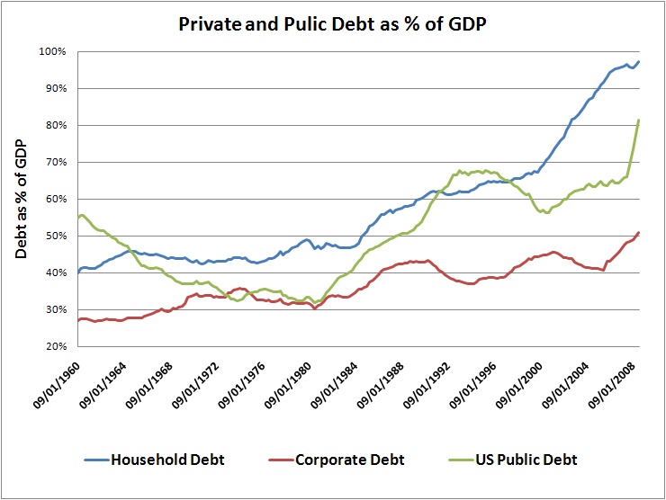 Debt has skyrocketed in the public and private arena since the 1980’s. The growth in debt has been fueled by the US dollar being the world reserve currency which has allowed the government and private individuals to borrow their way to prosperity. The growth in household debt to propagate a consumer culture and import society has been the most spectacular. This is unsustainable. Whether we are able to keep this ball rolling for another few years is immaterial. The fact is that whether slowly or quickly, the whole thing needs to be corrected. This could be through years of slow growth and depreciating assets or a quick collapse of the dollar and effective default on debts(maybe even through equitizing debt).