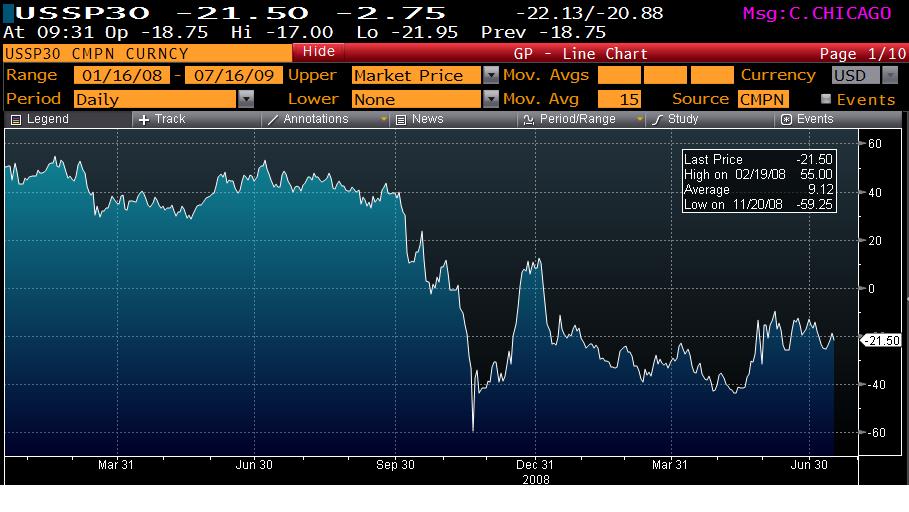 So that was a long winded way of getting to the problem. Starting in November of 2008, 30 year swap spreads turned negative – implying that it was less risky to borrow for 30 years from JP Morgan than from the US government. Not only did they turn negative, but they turned massively negative all the way to -59bps on November 20th, 2008. They went positive in December, but then slid back into negative territory and have stayed there since. Right now we are sitting at about -20bps.