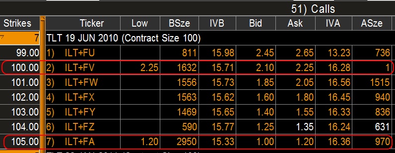 If you sell these call options at the ask price, then you receive $2.25 for the $100 strike or $1.20 for the $105 strike. This will pay you $225 or $120 per option sold as long as rates do not go lower than 4% or 3.5% by June of 2010. I think this is a high probability trade. If you want to make this more aggressive then you can look at selling the calls and buying put options. That way the purchase of the puts would be partially paid for by the written calls.