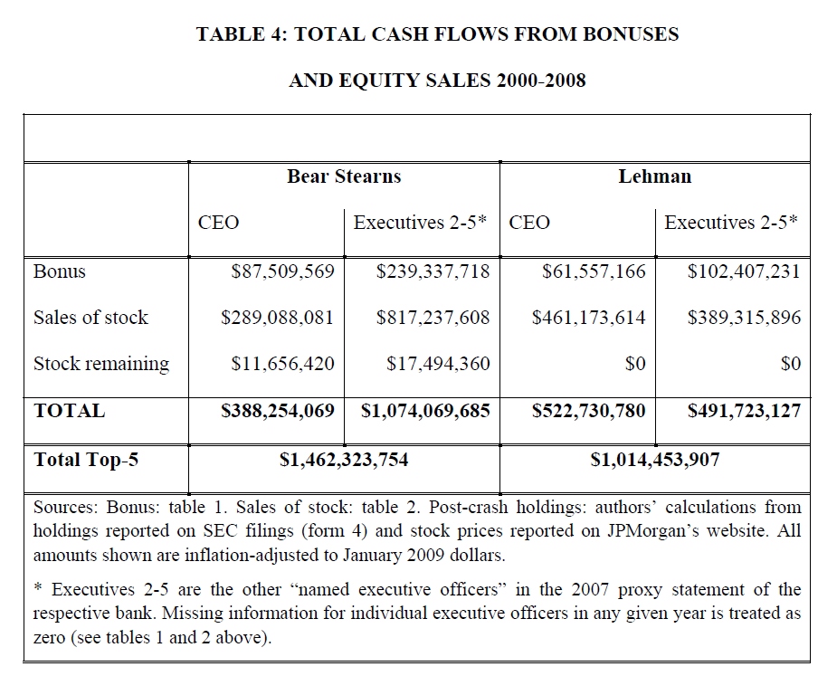 That was the question addressed by Bebchuk, Cohen, & Spamann in The Wages of Failure: Executive Compensation at Bear Stearns and Lehman 2000-2008. It was widely assumed that the executives of Bear Stearns and Lehman Brothers lost a tremendous amount of wealth as the stocks plummeted towards zero. The truth is less endearing. It turns out that the top 5 executives at Bear Stearns took home compensation in the form of bonuses and equity sales of nearly nearly $1.5B between 2000 and 2008. The top 5 executives at Lehman Brothers did not do quite as well with a mere $1B over the same time period.