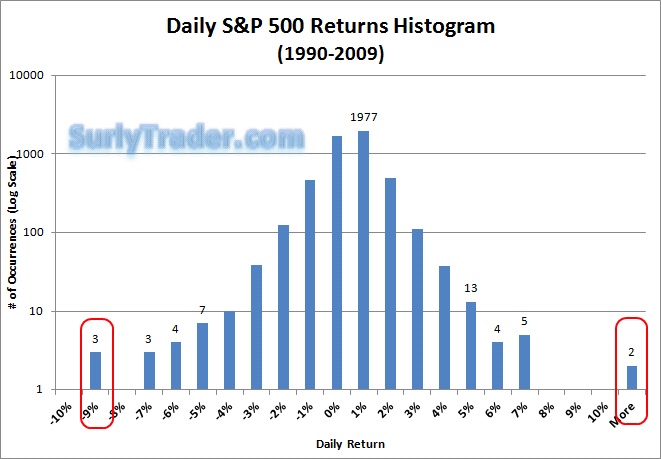 If you are scratching your head in utter confusion, do not worry. I will continue to delve into this topic with examples and pictures so that we can all grasp the basics. The general idea for the strategy is that options inherently trade at an implied volatility that is higher than realized volatility on average. Some academics (Nassim Taleb) believe that options trade at a higher implied volatility because Black-Scholes assumes a normal, bell shaped, distribution in stock returns. We can all agree that stock returns are anything but normal after going through the extreme volatility of 2008. In fact, during the 4th quarter of 2008 the S&P 500 had moves in excess of +/-5% during 25% of the trading days. If we assume that the S&P 500 has a long-term standard deviation of 20% on average, then a 5% daily move is in excess of 4 standard deviations. In a nutshell, equity markets are fat-tailed, meaning that observations that are far away from the mean happen much more frequently than a normal distribution can account for. Nassim Taleb would argue that these “Black Swan” events more than wipe out the small profits from selling options.